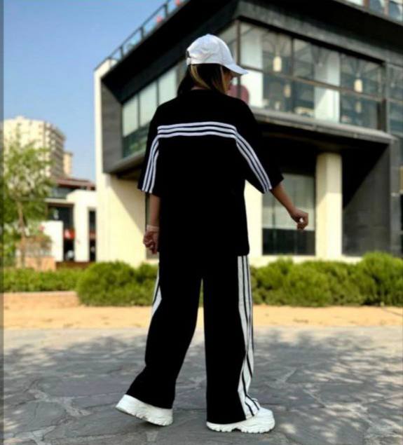 ست تیشرت شلوار زنانه جنس پنبه گلکسی طرح ادیداس ۳خط تک رنگ مشکی