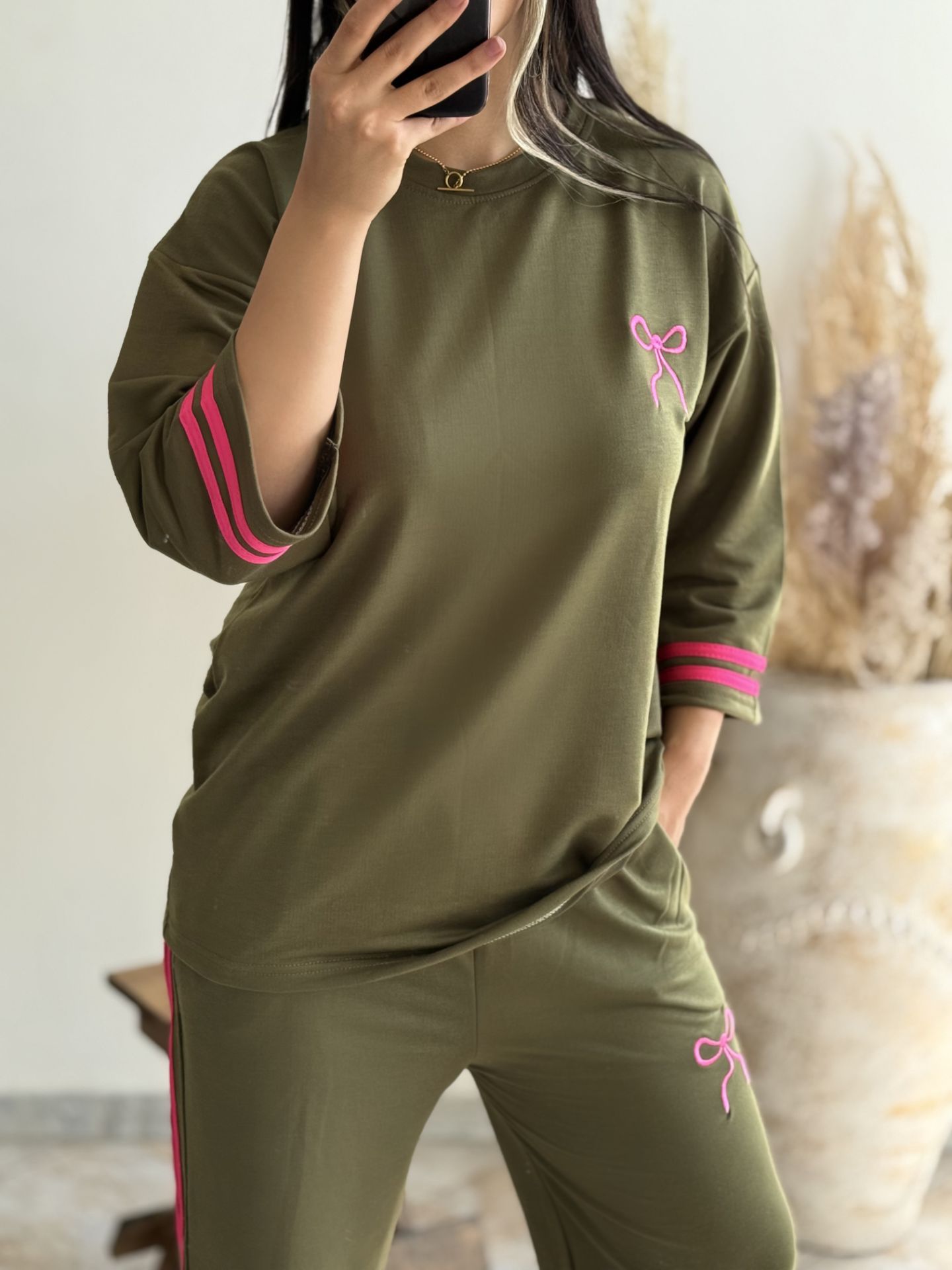 این ست دو تکه با گلدوزی ظریف و جزئیات پاپیون، از جنس پارچه گلکسی تولید شده که نرمی و لطافت فوقالعادهای دارد. فری سایز تا ۴۶ مناسب انواع اندامها.
