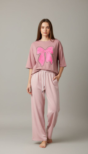 ست میکس زنانه تیشرت لانگ و شلواربگ جنس نخ پنبه طرح میکس